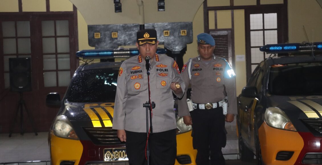 Kapolresta Serkot Kombes Pol. Yudha Satria, S.H., S.I.K., M.H. memimpin kesiapan apel patroli skala besar di lapangan hitam Polresta Serkot.