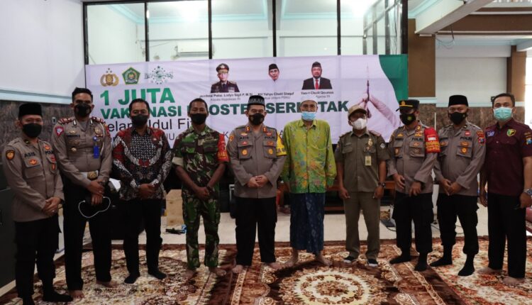 KH Masbuhun Faqih pengasuh Pondok Pesantren Mambaus Sholihin bersama Kapolres Gresik AKBP Mochamad Nur Azis, Kasat Lantas Polres Gresik AKP Engkos Sarkosi, Kapolsek Manyar AKP Windu Prayitno beserta PJU dan Forkopimcam Manyar meninjau vaksinasi booster kepada Pengasuh Santri dan Santriwati Ponpes Mambaus Sholihin Desa Suci yang diikuti sebanyak 90 orang.