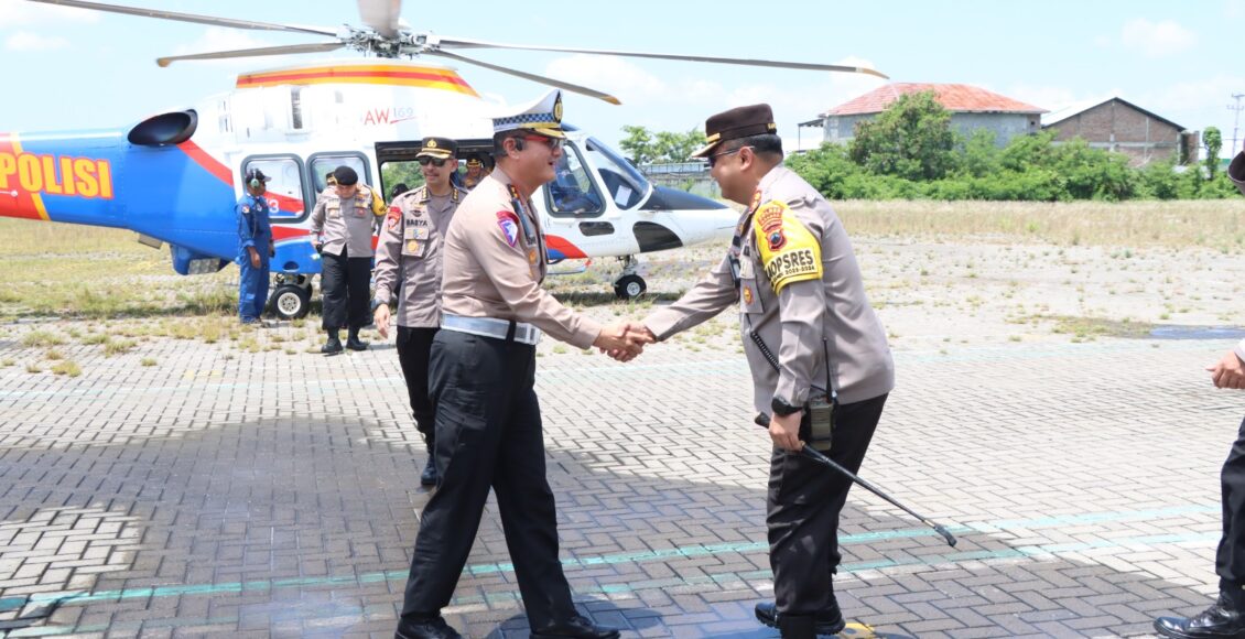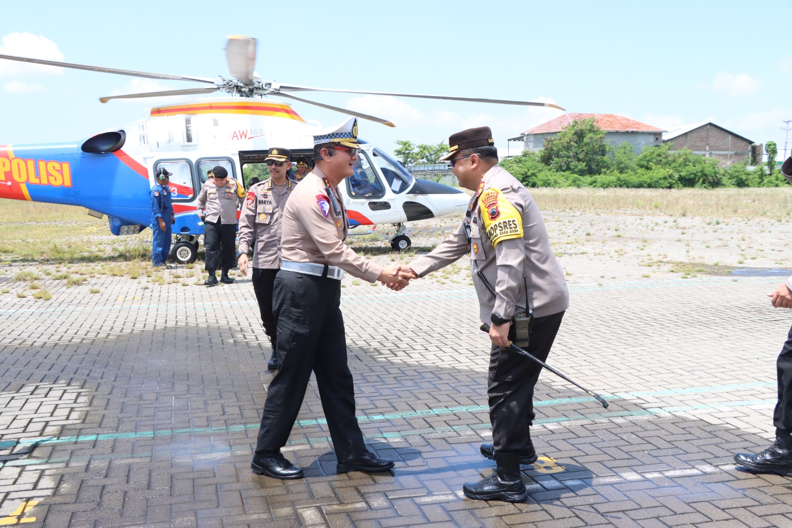 Kedatangan rombongan yang mengggunakan Helycopter tersebut disambut oleh Kapolres Brebes AKBP Guntur M Tariq di lapangan Dealer Nasmoco masuk Desa Klampok Kecamatan Wanasari Brebes.