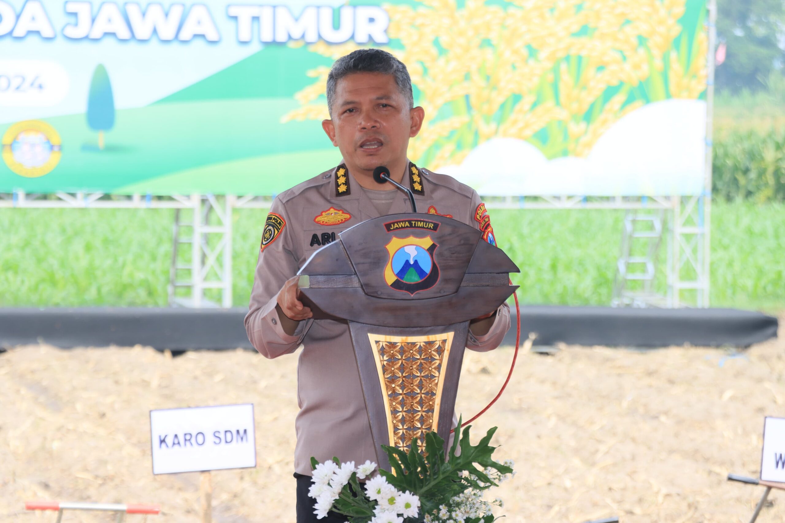 Karo SDM Polda Jatim Kombes Pol Ari Wibowo, S.I.K. M.H. pimpin tanam bibit jagung di lahan pertanian milik Pemerintah Kota Kediri, dengan pengelolaan oleh Kelurahan Ketami yang dikerjakan oleh Kelompok Tani Subur Rejeki, Rabu (13/11/24).