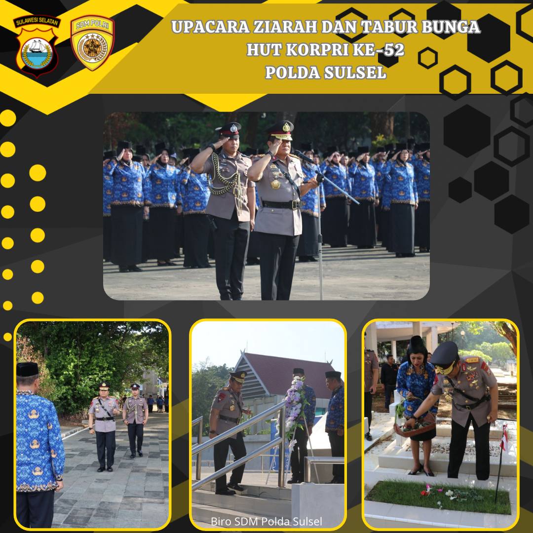 Ziarah dan tabur bunga di hadiri Karo SDM Polda Sulsel Kombes Pol Denny Y. Putro, SIK, M.Si dipimpin Ketua Korpri Polda Sulsel Pembina dr. Asnani dan diikuti oleh perwakilan PNS Polda Sulsel.