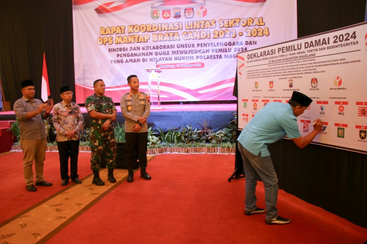 Tidak hanya itu, dalam Rapat Koordinasi itu juga dilaksanakan pembacaan dan penandatanganan Deklarasi Pemilu Damai oleh penyelenggara dan peserta Pemilu 2024 wilayah hukum Polresta Magelang.