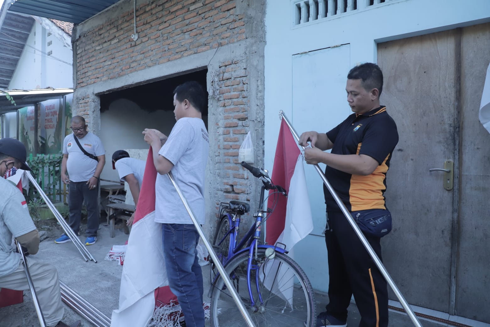 Kehadiran petugas dengan jalan kaki untuk membagikan bendera merah putih  dan umbul-umbul gratis kepasa warga, tidak itu saja Anggota Polres Kediri Kota juga bergotong royong dengan warga memasang bendera dan umbul umbul di depan rumah warga serrta di gapura gapura pintu masuk kampung.