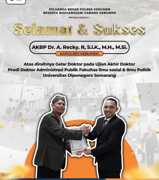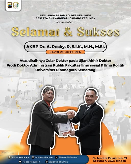 Selamat dan Sukses Kepada  Kapolres Kebumen AKBP Dr. A. Recky. R , S.I.K., M.H.,M.SI Atas Diraihnya Gelar Doktor Administrasi Publik.