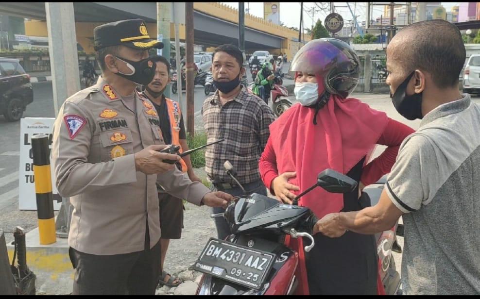 Bernasib baik, ibu hamil yang menggunakan sepeda motor sendirian ditolong dengan sigap oleh petugas kepolisian lalu lintas Direktorat Lalu Lintas (Ditlantas) Polda Riau.