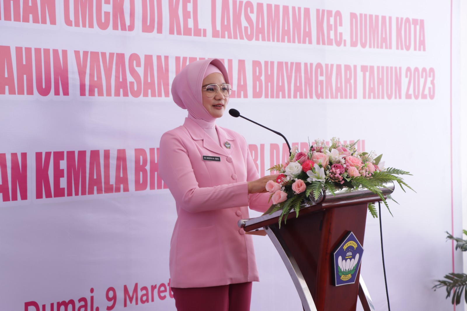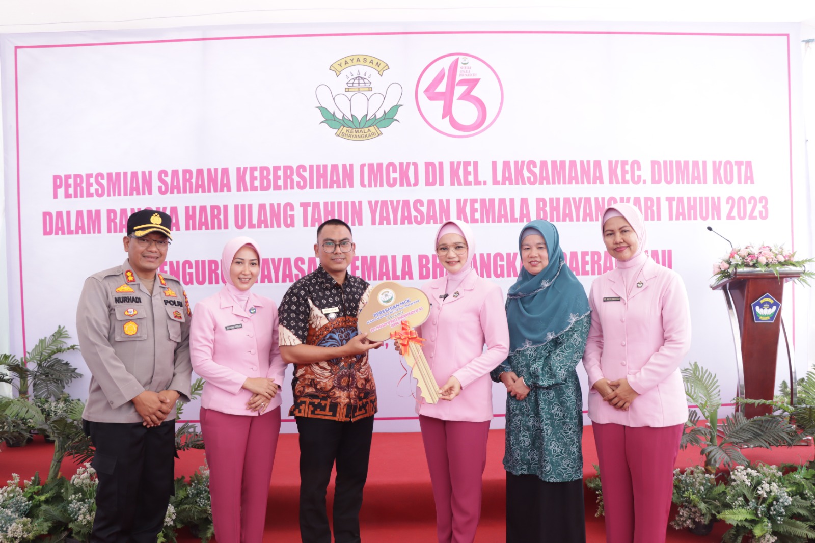 Dalam pelaksanaannya, Ketua Bhayangkari Daerah Riau Ny. Nindya M. Iqbal menyerahan 3 unit sarana fasilitas umum MCK secara simbolis kepada Camat Dumai Kota Indra Safawi, S.Sos, M.Si.