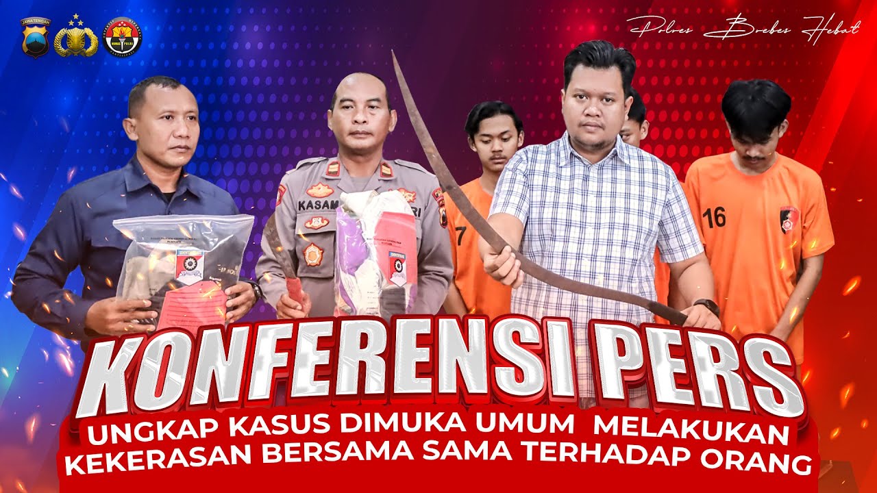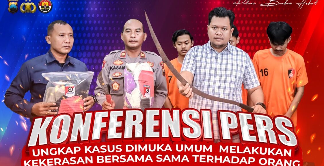 Konferensi Pers Ungkap Kasus Dimuka Umum Melakukan Kekerasan Bersama sama Terhadap Orang TKP Kecamatan Bumiayu Wilayah Hukum Polres Brebes, Jumat 21 Juli 2023 pukul 11.30 WIB bertempat di Ruang Konferensi Pers Polres Brebes.