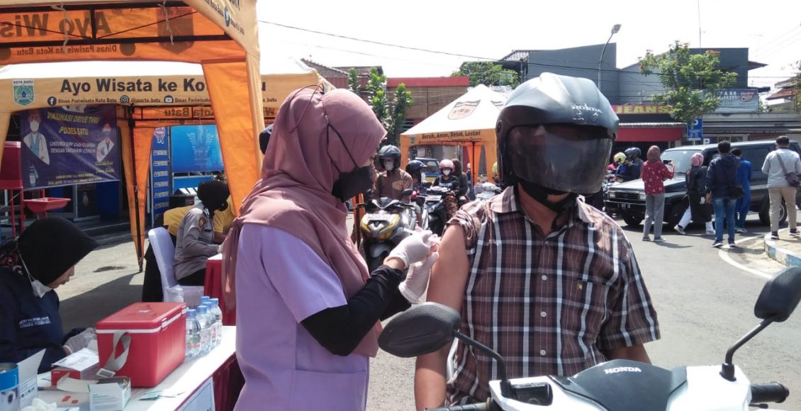 Petugas Percepatan vaksinasi yang dimotori oleh Satlantas Polres Batu dan Satuan Tugas Gugus Covid Kota Batu terlibat langsung untuk melayani pengguna jalan masyarakat yang antusias melaksanakan vaksinasi.