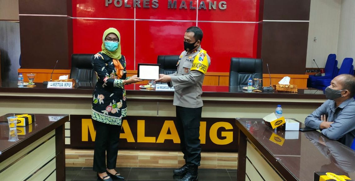 Selanjutnya, acara dilanjutkan dengan penyerahan cindera mata sebagai bentuk ucapan terima kasih kami terhadap dukungan yang diberikan dan kerjasama Polres Malang dalam penyelenggaraan Pemilihan Bupati dan Wakil Bupati Malang yang dapat berjalan aman dan kondusif.