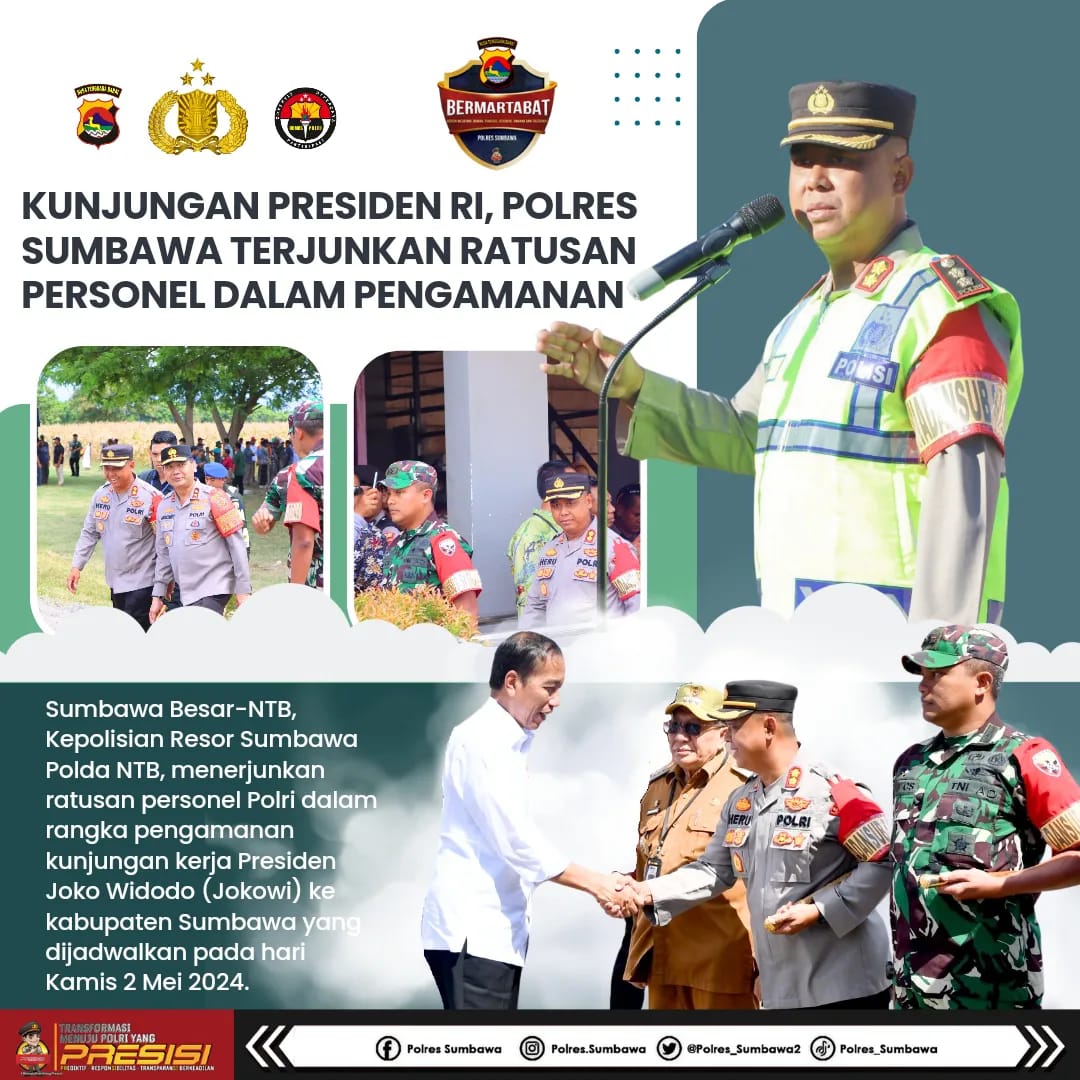 Sumbawa Besar-NTB,ikagawanews.id – Kepolisian Resor Sumbawa Polda NTB, menerjunkan ratusan personel Polri dalam rangka pengamanan kunjungan kerja Presiden Joko Widodo (Jokowi) ke kabupaten Sumbawa yang dijadwalkan pada hari Kamis 2 Mei 2024.