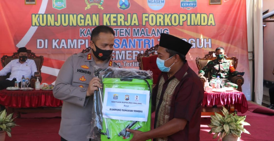 Selanjutnya, Forkopimda meninjau kantor sekretariat kampung tangguh semeru dan di lanjutkan meninjau alat kesehatan spt Masker, Hand Sanitizer dan menyerahkan bantuan kepada 5 org anak yatim piatu.