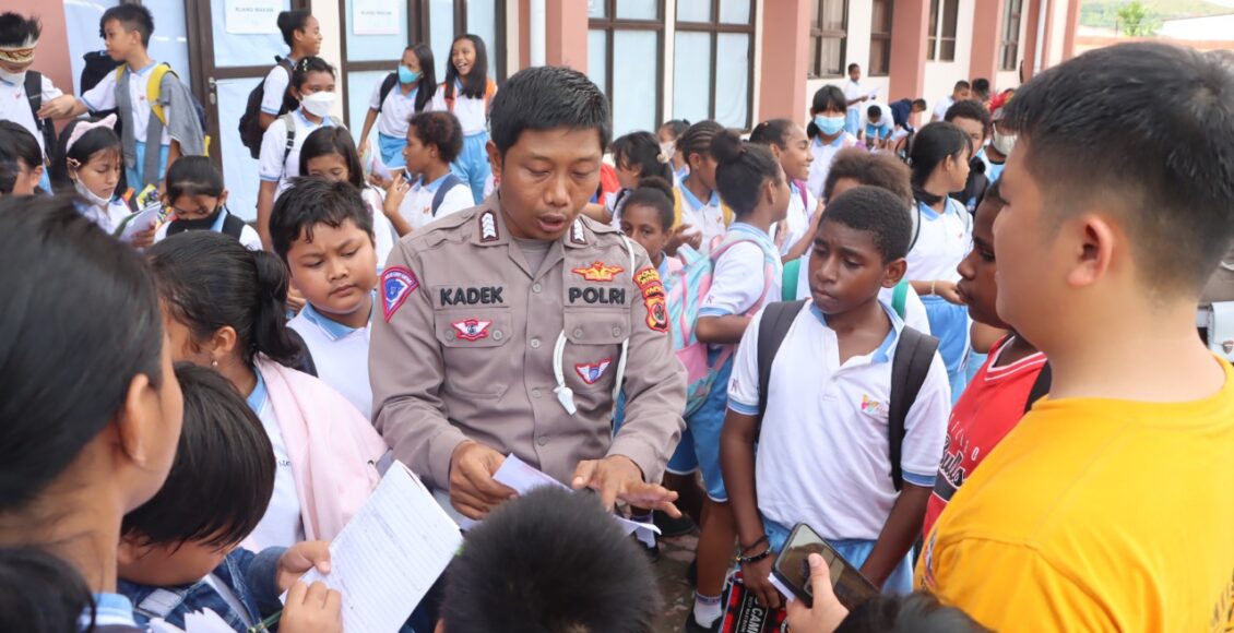 Kunjungan anak-anak SD Kristen Kalam Kudus Sentani yang didampingi guru disambut hangat oleh KBO Lantas Iptu Yohan Yawan beserta anggota lainnya di Mapolres Jayapura.