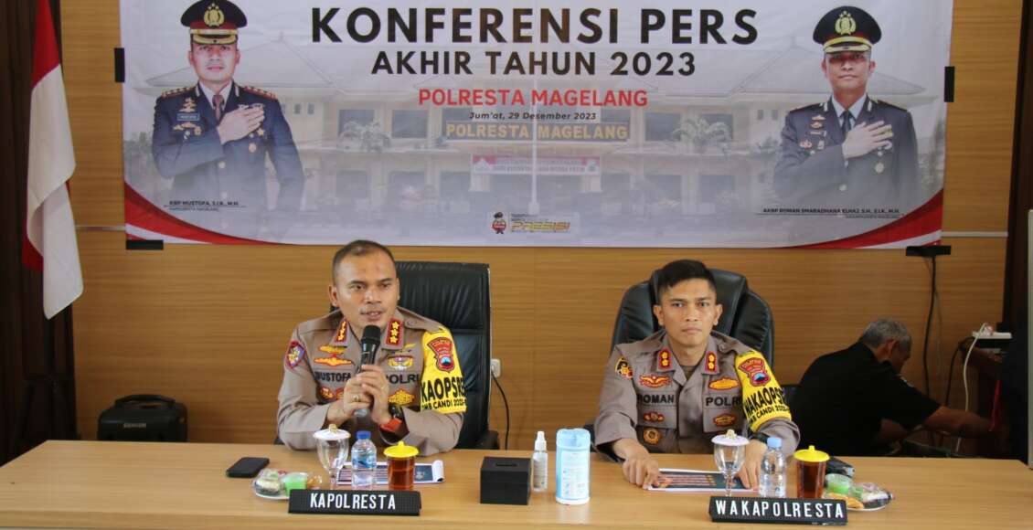 MAGELANG,ikagawanews.id – Polresta Magelang Polda Jawa Tengah menggelar Konferensi Pers Akhir Tahun 2023 bertempat di Media Center Polresta Magelang, Jumat 29/12/2023). Kegiatan dipimpin langsung oleh Kapolresta Magelang Polda Jawa Tengah KBP Mustofa, S.I.K., M.H. didampingi Wakapolresta AKBP Roman Smaradhana Elhaj, S.H., S.I.K., M.H., serta Kasat Reskrim, Kasat Lantas dan Kasat Narkoba.