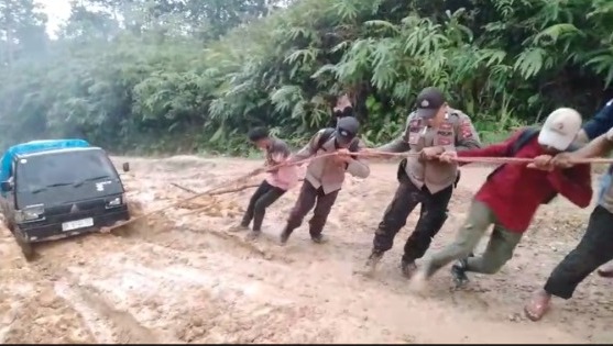 Petugas pengamanan dan pendistribusian logistik pemilu langsung membantu melakukan evakuasi mobil yang terhambat oleh akses jalan medan lumpur tersebut.