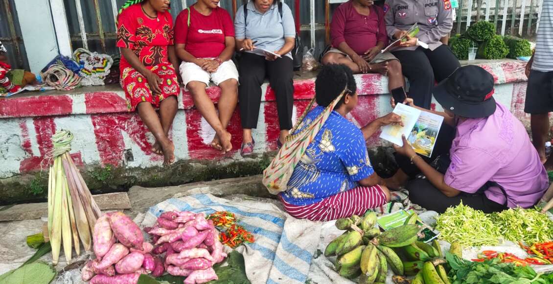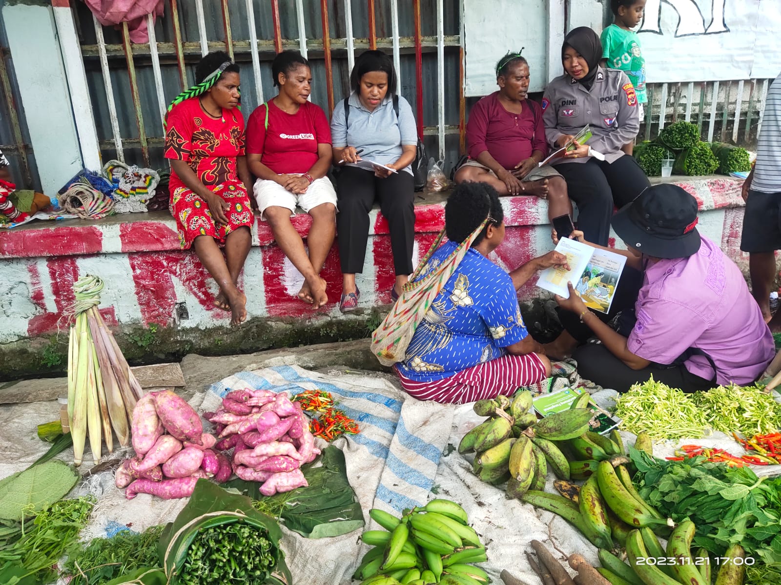 Sembari berjualan sayur dan menunggu para pembeli Mama Nella Mirin (43), Omi Murtilib (35) dan Ribka Websa (37) disambangi Polwan Polres Jayapura untuk melanjutkan kegiatan belajar.