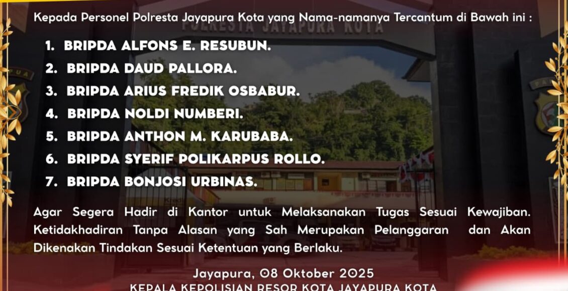 Jayapura Kota,ikagawanews.id – Tegakkan disiplin di internal Kepolisian, Kapolresta Jayapura Kota Kombes Pol Fredickus W. A. Maclarimboen, S.I.K., M.H., CPHR memberikan himbauan tegas kepada tujuh personel yang tercatat malas hadir dan tidak melaksanakan tugas sebagaimana mestinya melalui rilis berita ini.
