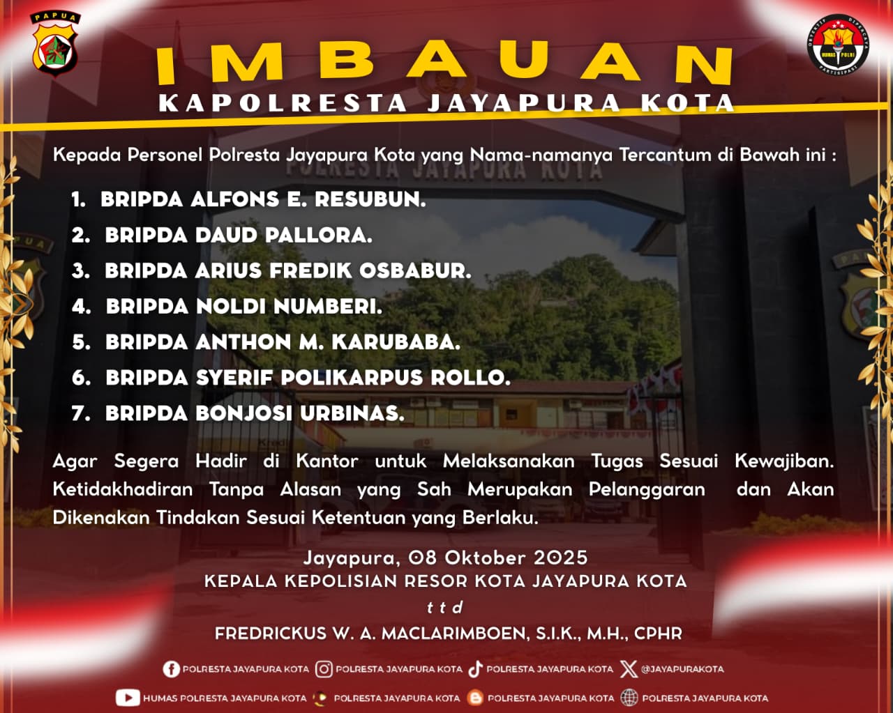 ”Ya, melalui media ini, saya selaku Kapolresta Jayapura Kota menghimbau tujuh personel saya yang tidak pernah masuk kantor untuk segera masuk dan laksanakan tugas sesuai dengan tanggung jawab yang diberikan,” ungkap Kapolresta KBP Fredickus Maclarimboen saat diwawancarai di Jayapura, Rabu (8/10) siang.
