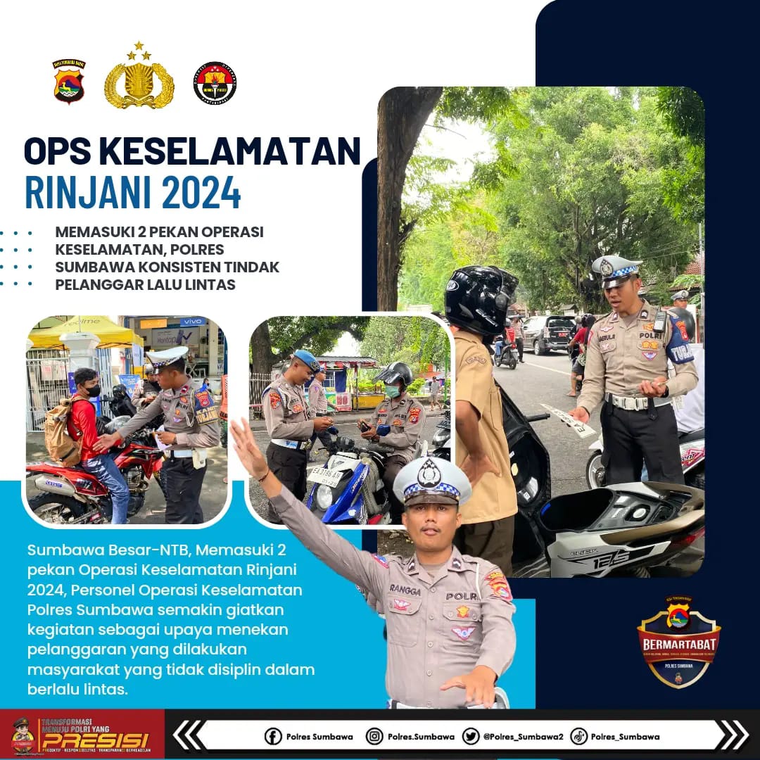 Sumbawa Besar-NTB,ikagawanews.id – Memasuki 2 pekan Operasi Keselamatan Rinjanu 2024, Personel Operasi Keselamatan Polres Sumbawa semakin giatkan kegiatan sebagai upaya menekan pelanggaran yang dilakukan masyarakat yang tidak disiplin dalam berlalu lintas.
