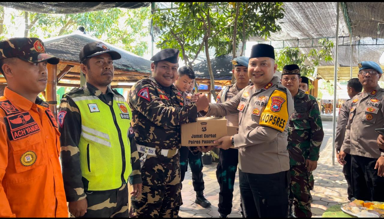 Kegiatan dilanjutkan dengan pemberian tali asih oleh Kapolres Pasuruan kepada Masyarakat dan anggota Banser berupa Paket Sembako, selanjutnya kegiatan Jum’at Curhat ditutup dengan Doa Bersama.(Red/Hum)