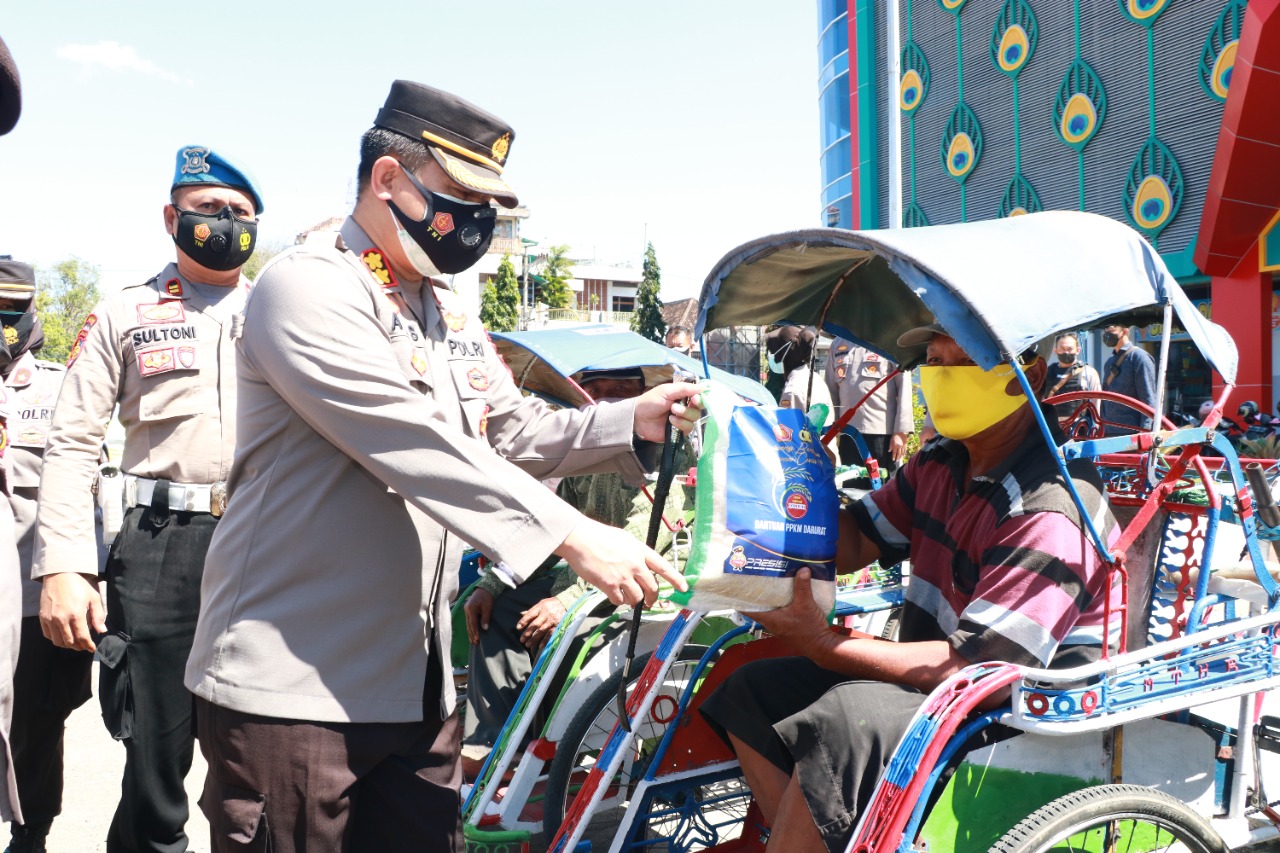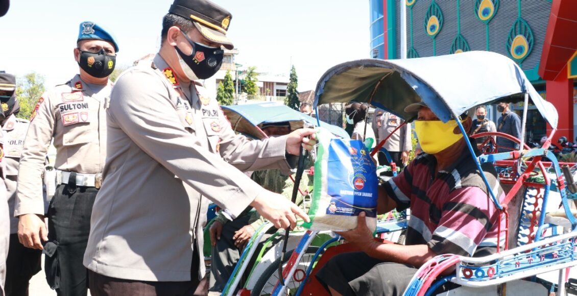 Kemudian Kapolres beserta rombongan jalan di sekitaran perkotaan dan berhenti di simpang 4 Pasar Legi Ponorogo,Kapolres juga menyapa serta berdialog dan mengedukasi abang becak juga juru parkir sambil memberikan bantuan beras dan juga masker.