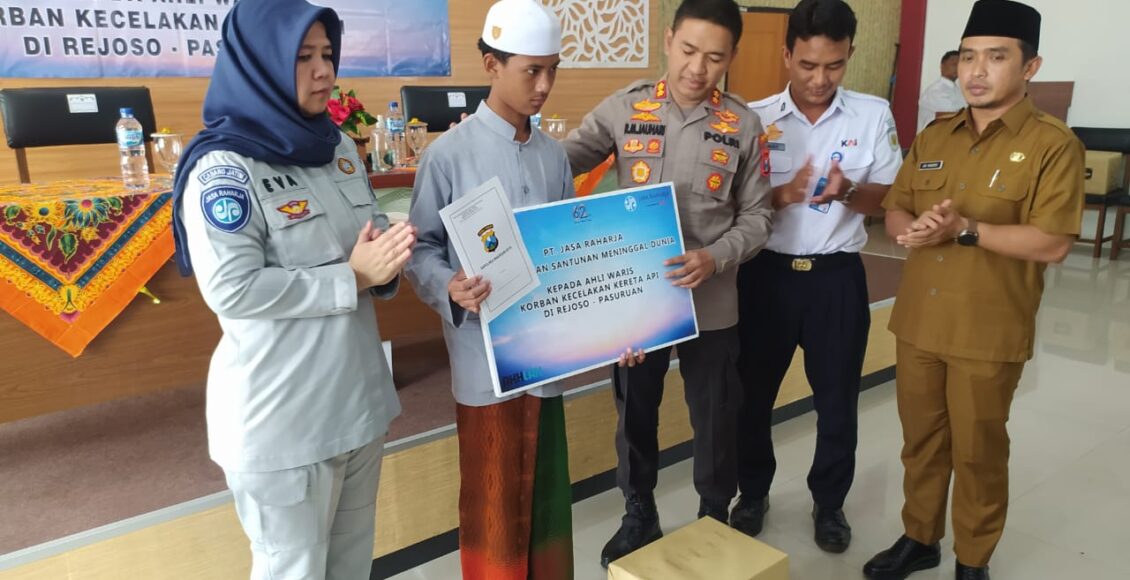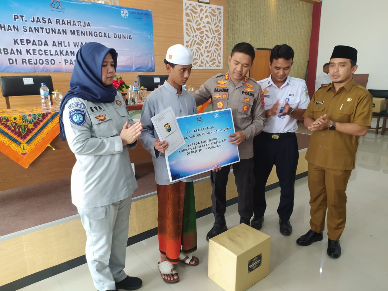 Penyerahan bantuan kepada ahli waris almarhum M. Said dilaksanakan di Pendopo Kecamatan Panggungrejo, Kota Pasuruan pada hari Selasa (03/01/2023). Yang dihadiri Kapolres Pasuruan bersama jajaran, Camat Panggungrejo Hermanto, Kepala Stasiun Kota Pasuruan Bangkit, dan Perwakilan Jasa Raharja Eva Yuliasta.