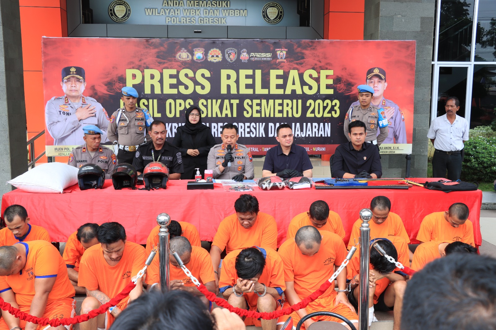“Polres Gresik berhasil mengungkap sebanyak 46 kasus dengan rincian 18 kasus curat, 18 kasus curanmor, dan 8 kasus penyalahgunaan sajam, dengan total tersangka sebanyak 21 orang,” tegas Kapolres Gresik AKBP Adhitya Panji Anom.