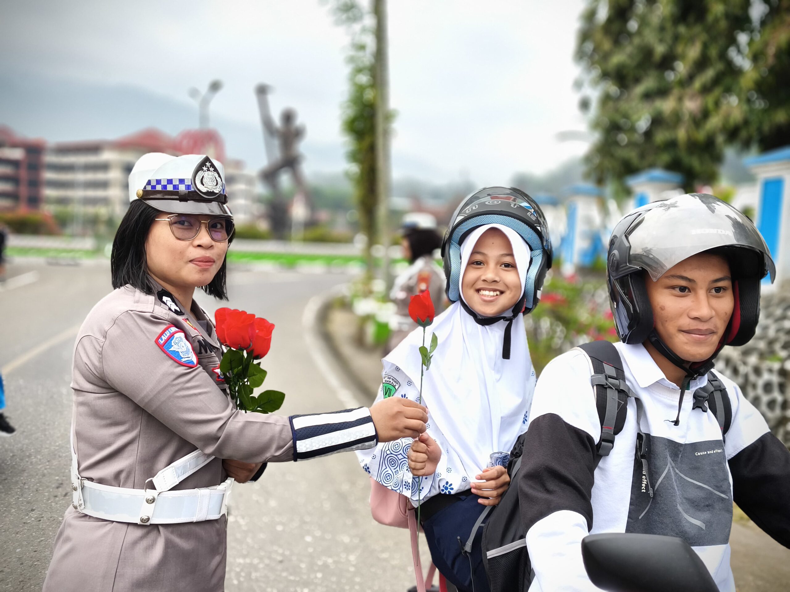 Selain helm, pengendara juga diberikan bunga dan cokelat sebagai simbol apresiasi atas kepatuhan dan kesadaran mereka dalam berlalu lintas.