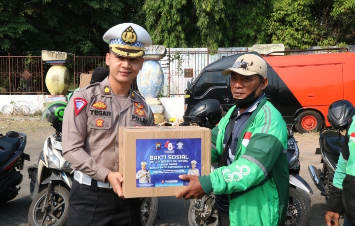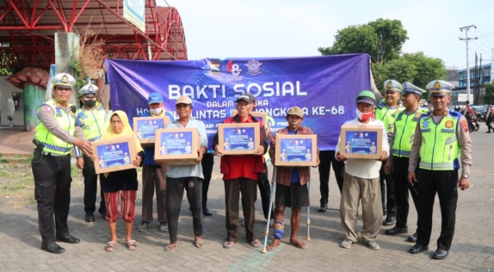 “Hari ini kami dari Ditlantas Bersama stakeholder terkait membagikan bantuan sosial kepada warga dengan sasaran antara lain komunitas supeltas, ojek online dan sopir angkot dalam rangka Hari Lalu Lintas Bhayangkara Ke-68 dan juga sosialisasi Operasi Zebra Candi tahun 2023,” ungkap AKBP Doni Prakoso.