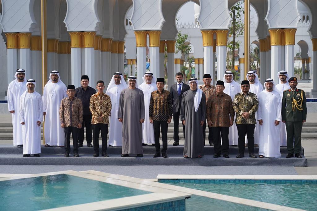 Disambut ribuan pelajar yang mengibarkan bendera Indonesia dan Uni Emirat Arab (UEA), setibanya di lokasi Presiden Jokowi dan Putra Mahkota sekaligus sebagai Presiden Uni Emirat Arab (UEA) Sheikh Mohammed Bin Zayed Al Nahyan langsung melaksanakan Shalat Sunnah dan doa. Dilanjutkan dengan penandatanganan prasasti oleh kedua kepala negara tersebut. Sebagai acara penutup kedua kepala negara tersebut melakukan penanaman Pohon Sala dilanjutkan foto bersama.
