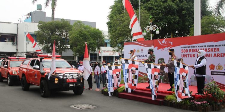 Sementara itu, 36 unit mobil masker yang diantaranya 20 unit mobil dari Kabupaten Malang, 10 unit mobil dari Kota Malang dan 6 unit mobil dari Kota Batu juga relawan yang bertugas siap membagikan 500.000 masker di seluruh wilayah Kabupaten/Kota di Malang Raya.