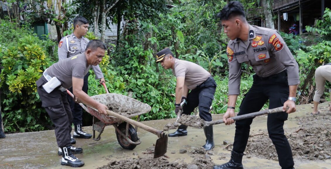 Pasca Banjir, Kapolres Pinrang Kerahkan Personil Bantu Bersihkan Sisa Material Banjir