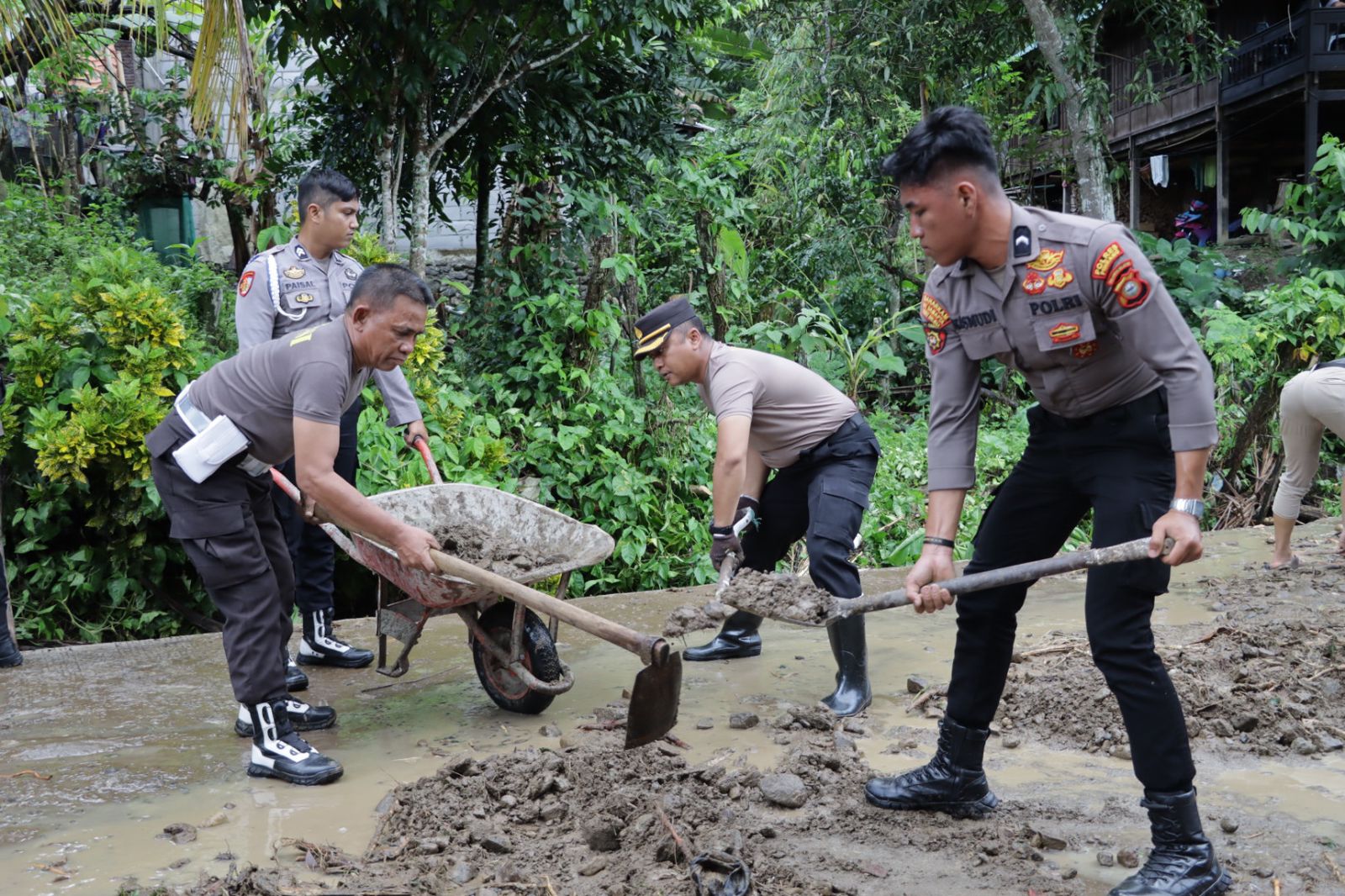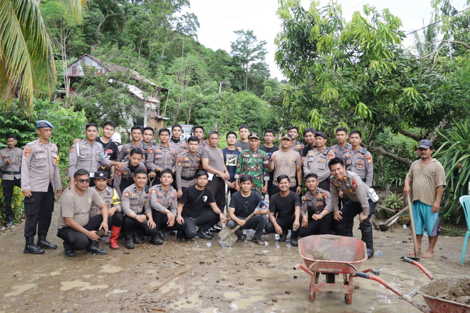 Kapolres Pinrang bersama Camat Batulappa, Danramil 1404-05 Patampanua , Kapolsek Patampanua ,PJU Polres Pinrang, Satu Pleton siaga bencana Polres Pinrang , Bhabinkamtibmas dan Babinsa gotong royong membantu bersihkan sisa material baik lumpur, kayu dan bebatuan lainnya yang ada disekitar rumah warga dan di tengah jalan. Kamis(09/05/24)