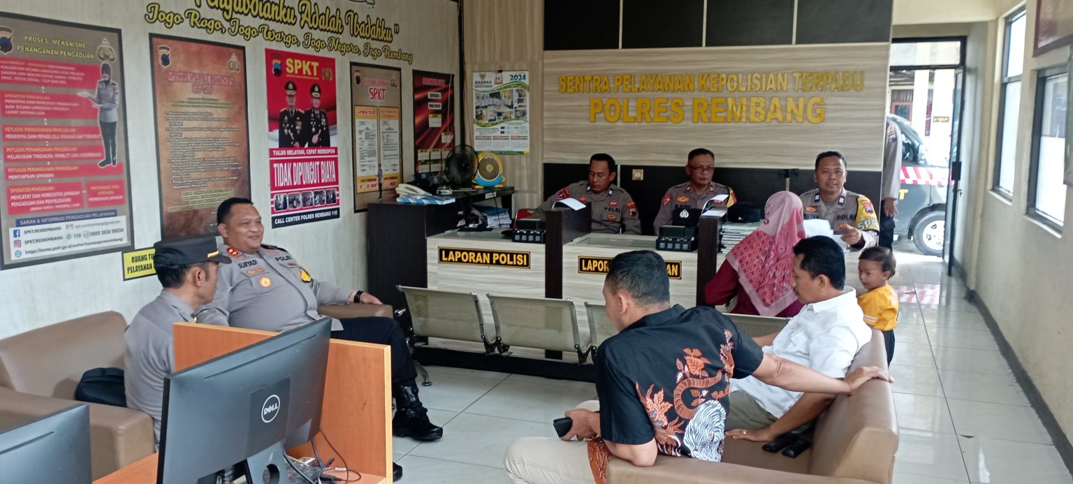 Kapolres Rembang AKBP Suryadi, S.I.K., M.H., mengecek kelengkapan ruangan SPKT mulai dari tata ruang, perangkat IT yang digunakan maupun kesiagaan personil yang melaksanakan piket di ruangan pelayanan SPKT.