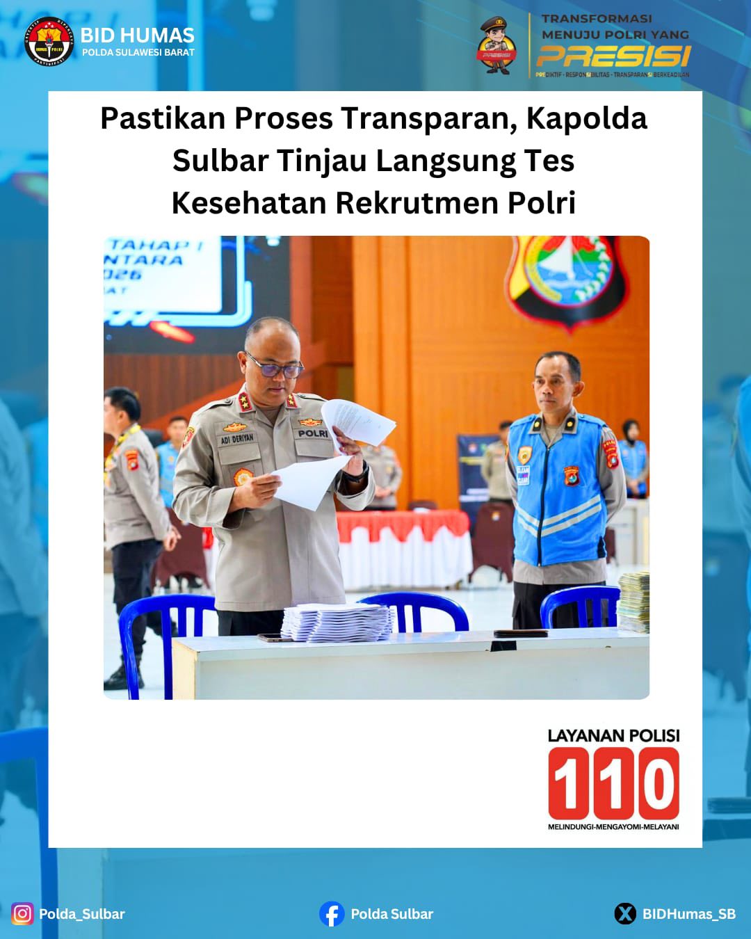 SULBAR,ikagawanews.id – Kepala Kepolisian Daerah Sulawesi Barat, Irjen Pol. Adi Deriyan Jayamarta, S.I.K., M.H. melakukan pemantauan langsung kegiatan tes kesehatan dalam rangka seleksi rekrutmen anggota Polri yang berlangsung di Aula Marannu Mapolda Sulbar, Kamis (16/4/26).