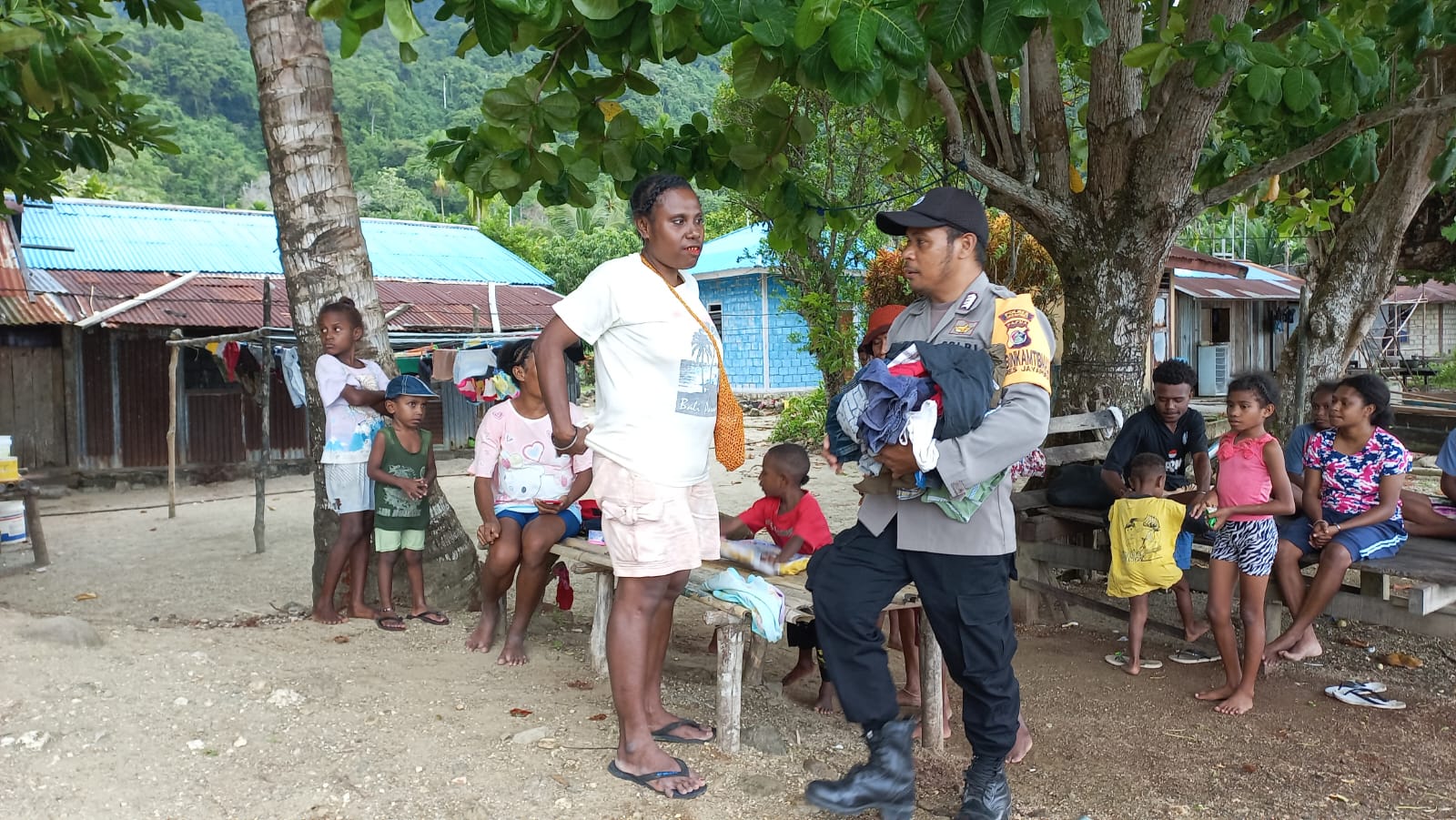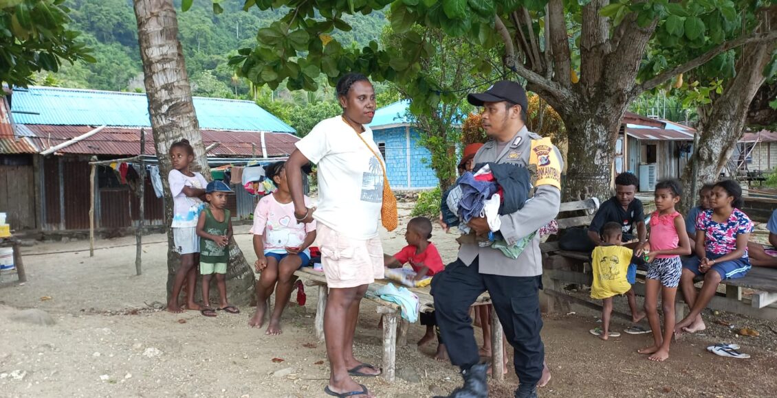Peduli Dengan Warganya, Bhabinkamtibmas Polsek Demta Bagikan Baju Bekas Layak Pakai