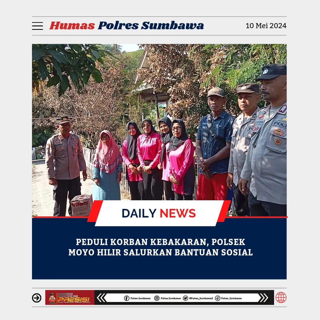Dalam kegiatan yang dipimpin langsung oleh Wakapolsek Moyo Hilir IPTU Husni didampingi personel dan juga Anggota Bhayangkari ranting Moyo Hilir tersebut menyerah sejumlah bantuan sosial berupa sembako kepada korban kebakaran.