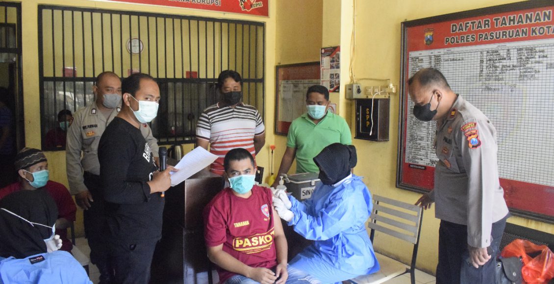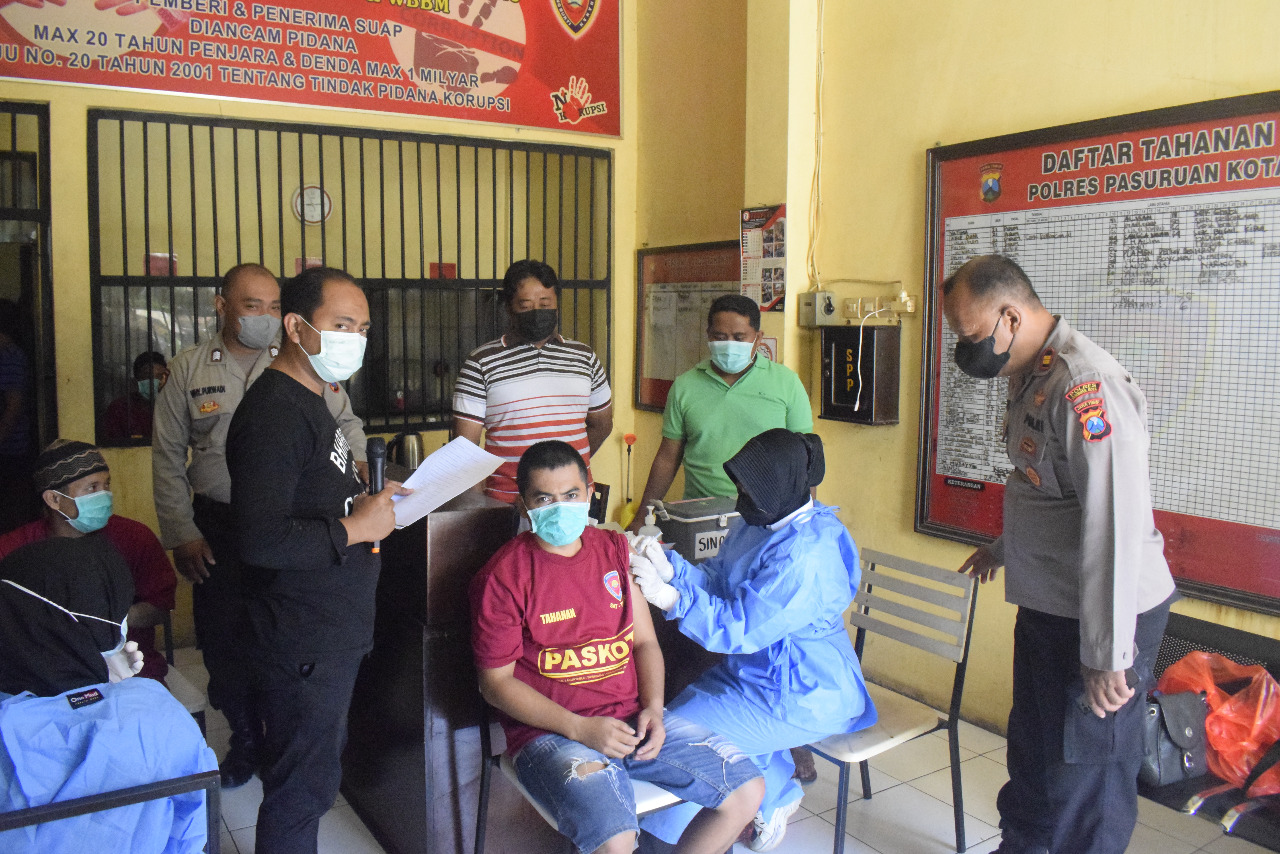 Sebanyak 66 orang yang sedang menjalani masa tahanan di rumah tahanan Polres Pasuruan Kota dan Polsek Jajaran mendapat layanan vaksinasi dengan rincian 52 orang tahanan Polres Pasuruan Kota, 3 orang tahanan Polsek Jajaran, 7 orang yang sudah melaksanakan vaksinasi, dan 4 orang tahanan yang ditunda vaksinasi.