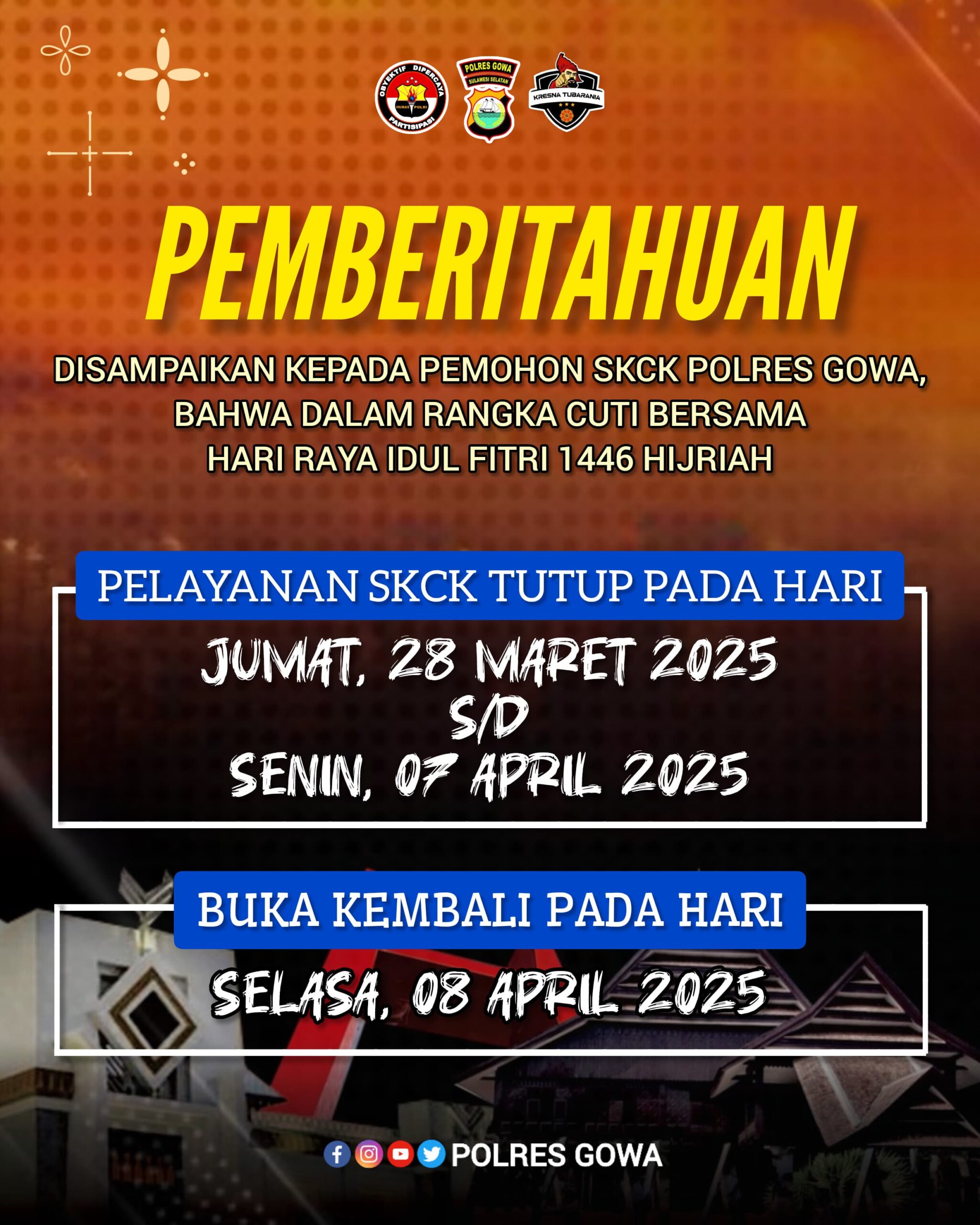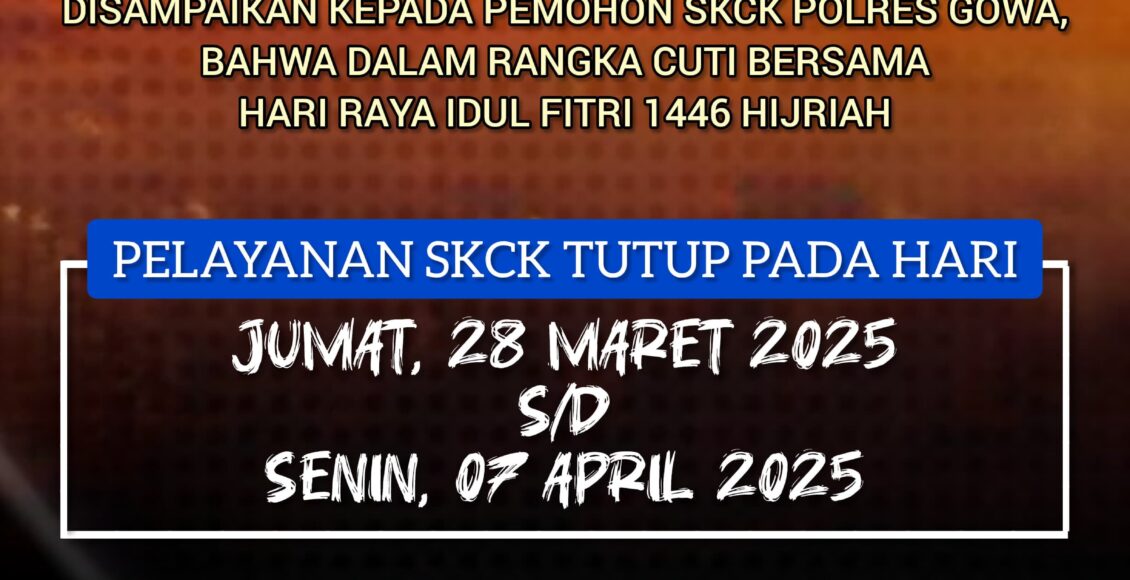 GOWA,ikagawanews.id – Satuan Intelkam (Satintelkam) Polres Gowa menginformasikan kepada masyarakat, khususnya pemohon Surat Keterangan Catatan Kepolisian (SKCK), bahwa layanan SKCK akan ditutup sementara dalam rangka cuti bersama Hari Raya Idul Fitri 1446 Hijriah. Selasa (25/3/2025).
