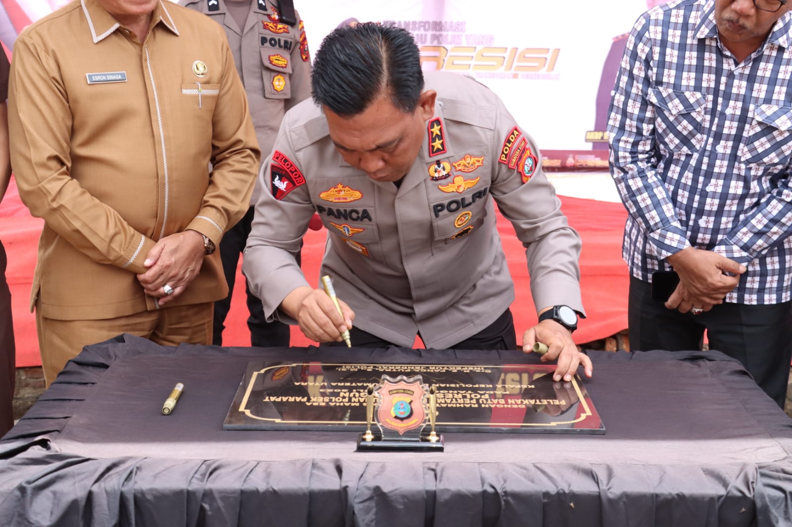 Peletakan batu pertama ini dihadiri oleh berbagai instansi dan tokoh masyarakat, termasuk Irwasda Polda Sumut Kombes Pol Drs. Armia Fahmi, Karorena Polda Sumut Kombes Pol Harries Budihartto S.I.K., M.Si, serta Ketua DPRD Simalungun Timbul J. Sibarani, dan lainnya.
