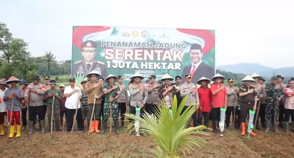 Kapolresta Banyumas menyerahkan secara simbolis bibit jagung kepada Ketua Kelompok Tani Desa Karang Talun Kidul, kemudian dilaksanaan penanaman jagung serentak oleh Forkopimda Kabupaten Banyumas dan dilanjutkan dengan zoom meeting kegiatan Penanaman Jagung serentak 1 Juta hektar di lahan perkebunan dalam rangka mendukung swasembada pangan tahun 2025 di seluruh Polda dan Jajaran Polres/ta/bes se Indonesia.(PID Presisi Humas Polresta Banyumas).