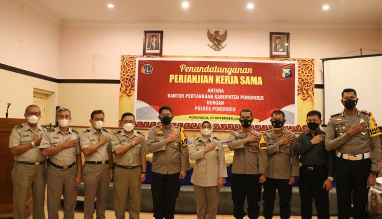 Surat dengan Nomor : 57/PKS-35.02/XI/2021 tentang kerjasama di bidang agraria/pertanahan antara Polres Ponorogo dengan Kantor pertanahan tersebut, ditanda tangani oleh Kapolres Ponorogo AKBP Catur dan Kepala Kantor Pertanahan Kab. Ponorogo Tutik Agustiningsih.