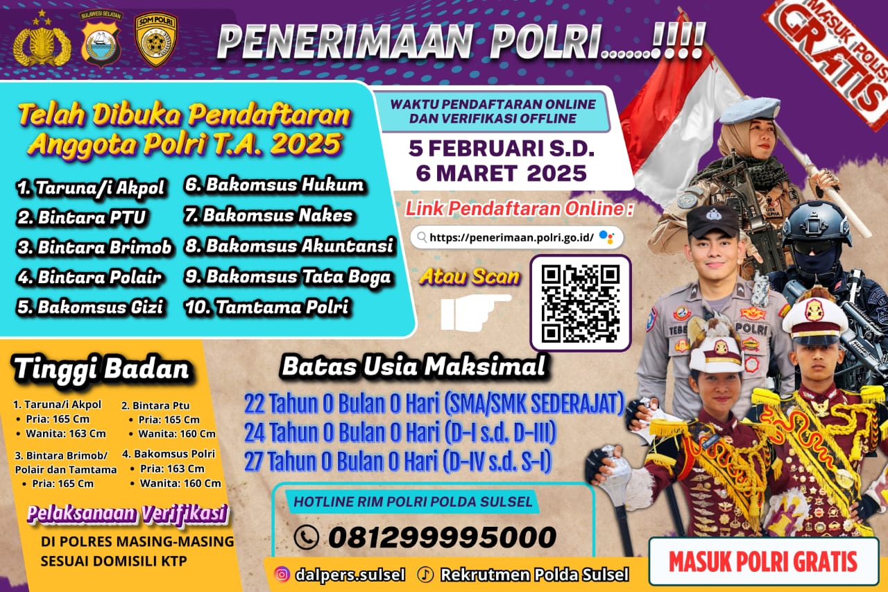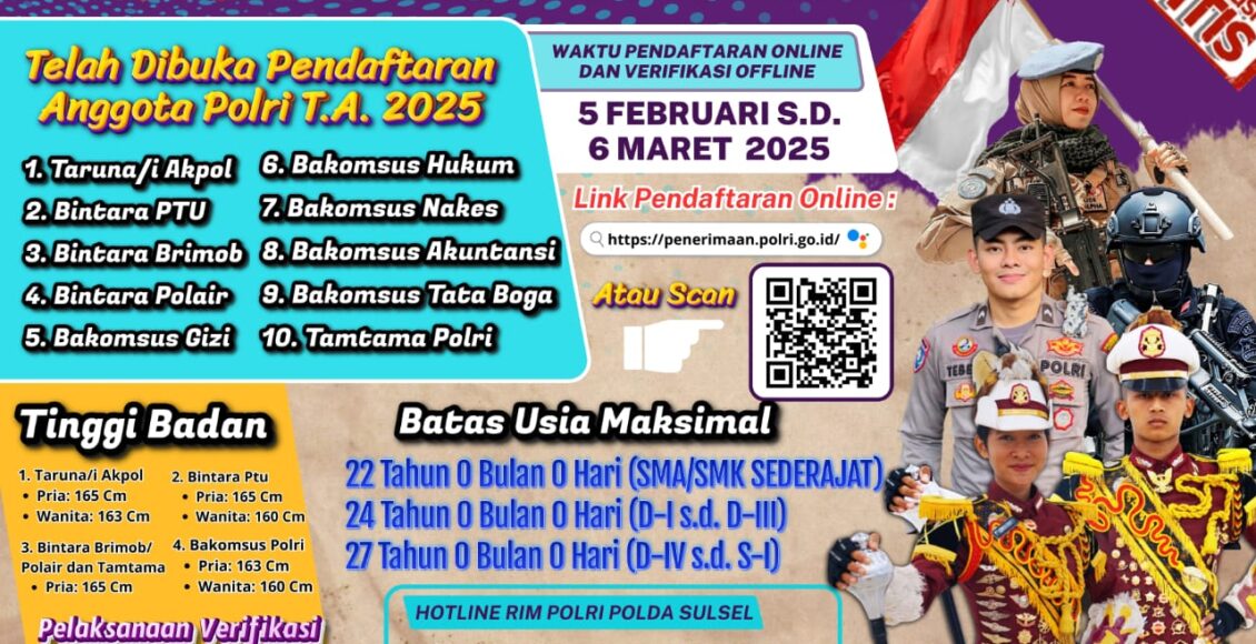 Tana Toraja,ikagawanews.id – Kepolisian Republik Indonesia (Polri) resmi membuka pendaftaran seleksi penerimaan anggota Polri melalui jalur Akademi Kepolisian (Akpol), Bintara dan Tamtama untuk tahun anggaran 2025.