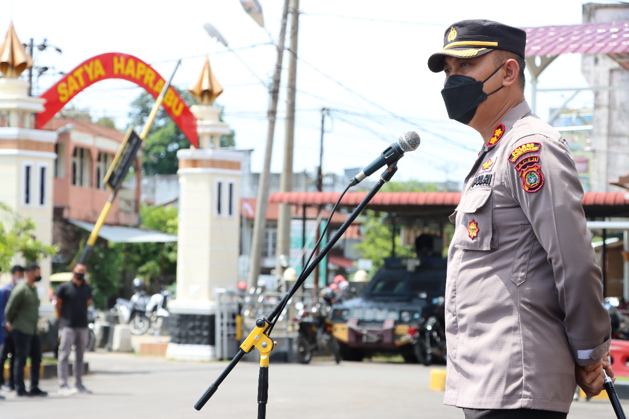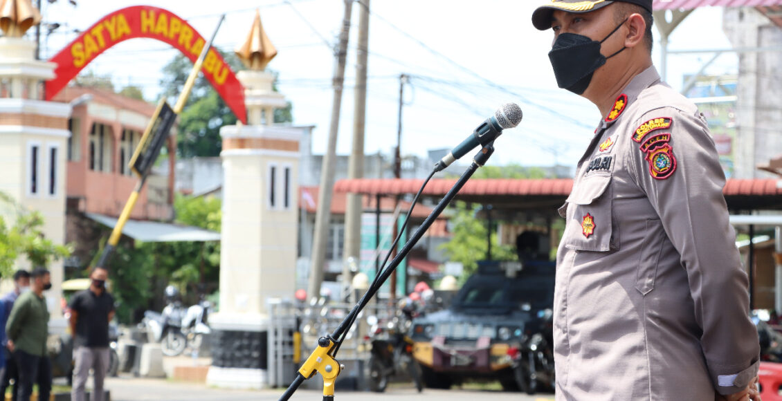 Tampak Kapolres Lhokseumawe AKBP Eko Hartanto SIK MH secara langsung memimpin apel dan memberi arahan kepada personel.