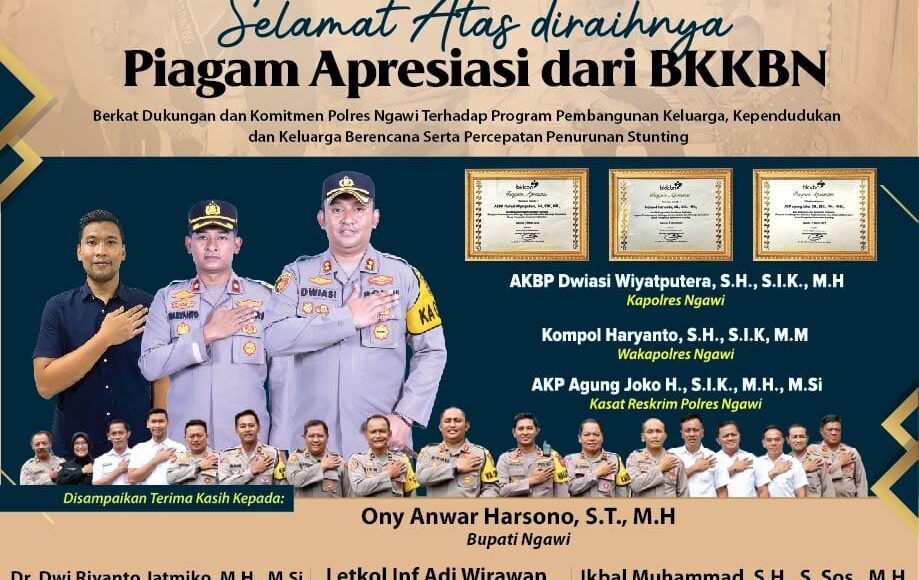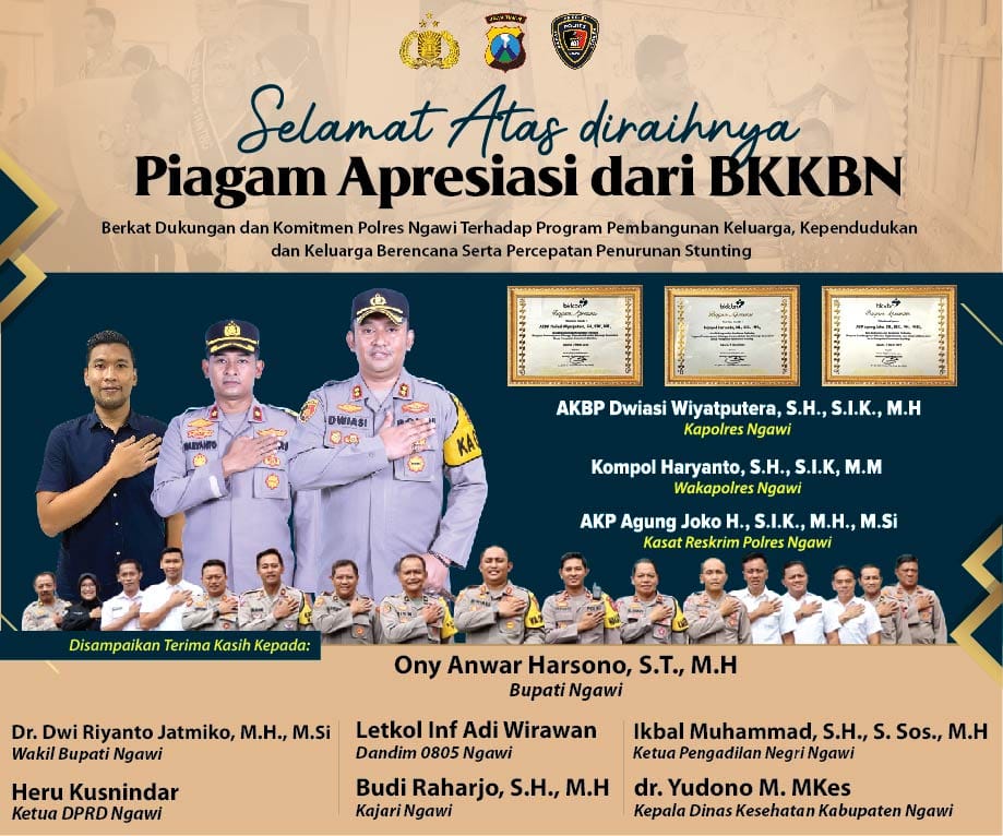 Penghargaan yang diterima Polres Ngawi berupa piagam apresiasi, karena telah memberikan dukungan dan komitmen yang luar biasa kepada BKKBN dalam program Bangga Kencana dan upaya mempercepat penurunan stunting.
