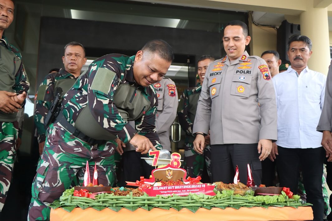 Dandim 0709 Kebumen Letkol Czi Ardianta Purwandhana bersama pejabat Kodim, serta puluhan personel Kodim datang ke Mapolres sambil membawa tumpeng sinergitas juga sebagai ungkapan bentuk rasa syukur, Senin 1 Juli 2024.