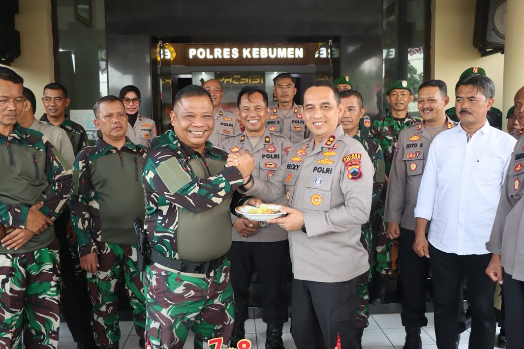 Dandim 0709 Kebumen Letkol Czi Ardianta Purwandhana bersama pejabat Kodim, serta puluhan personel Kodim datang ke Mapolres sambil membawa tumpeng sinergitas juga sebagai ungkapan bentuk rasa syukur, Senin 1 Juli 2024.