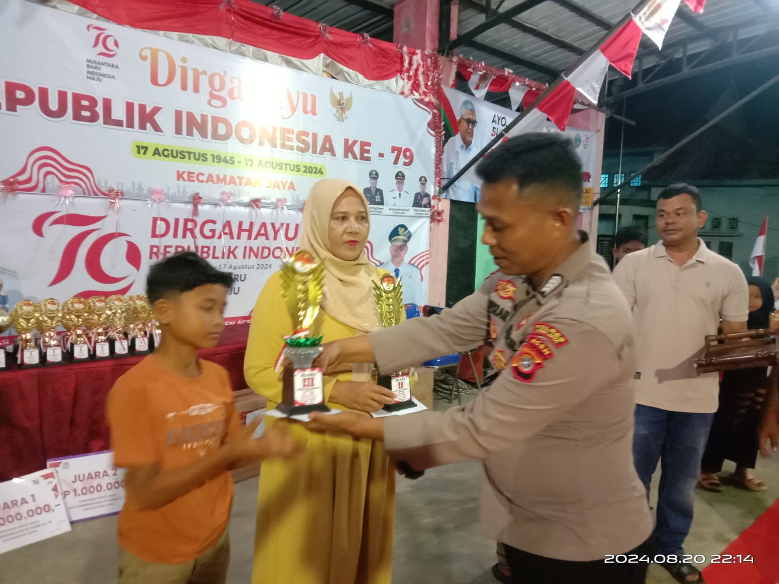 Penyerahan piala dan hadiah dilakukan langsung oleh Camat Jaya, didampingi oleh pejabat lainnya yang hadir. Para juara lomba dari berbagai kategori menerima penghargaan atas usaha dan kreativitas mereka dalam mengikuti rangkaian perlombaan, yang meliputi lomba olahraga, seni, dan kegiatan lainnya yang telah digelar sejak awal bulan Agustus.