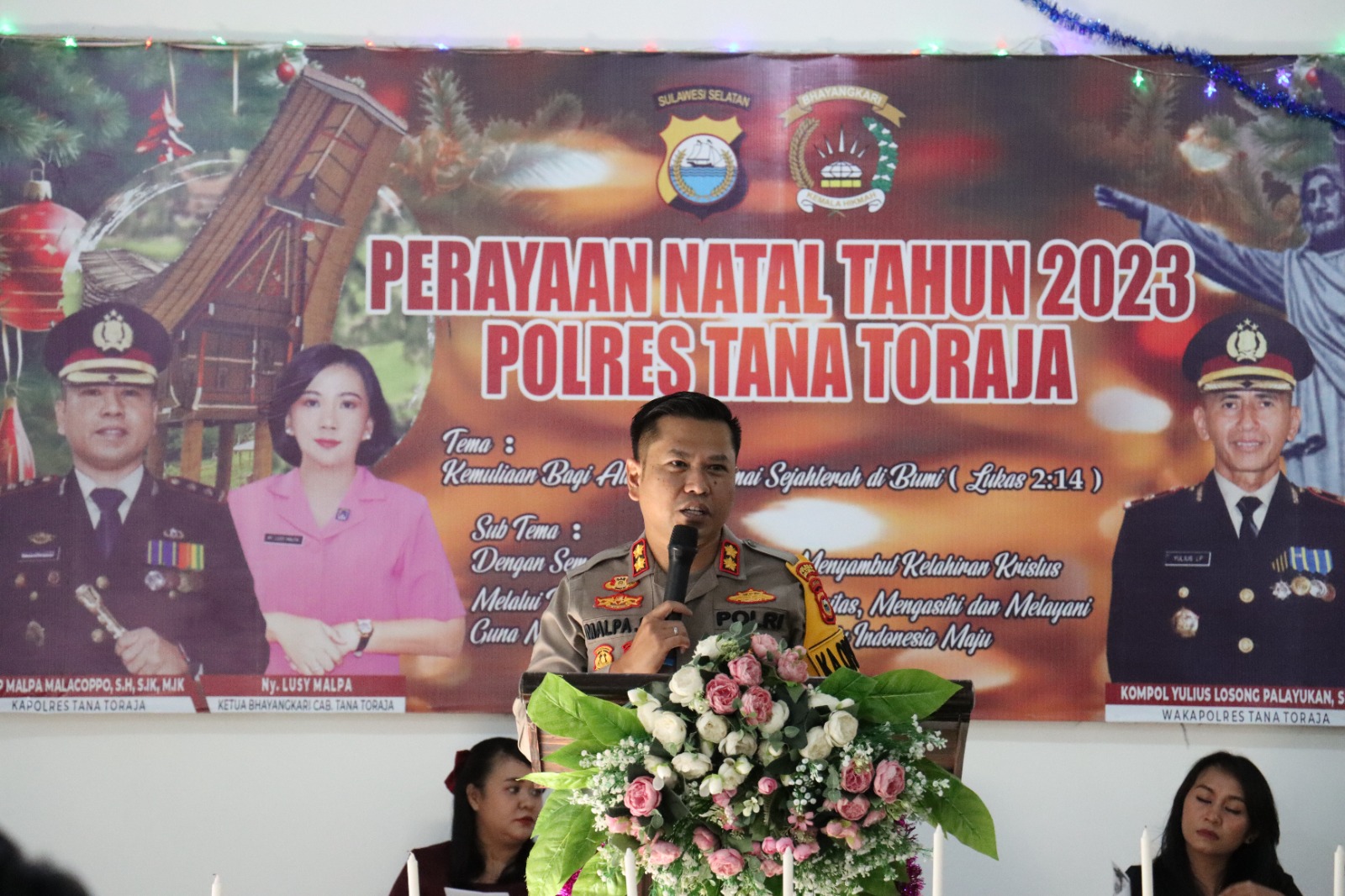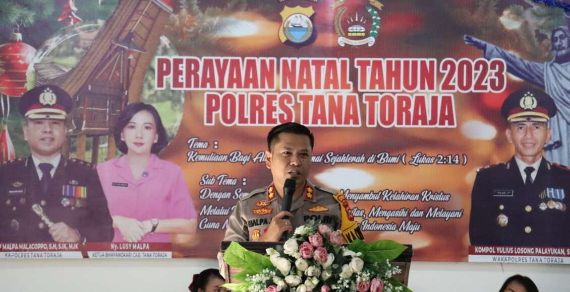 Perayaan Natal Polres Tana Toraja bertemakan “Kemuliaan Bagi Allah dan Damai Sejahterah di Bumi (Lukas 2:14)” dengan sub tema “Dengan Semangat Kerendahan Hati Menyambut Kelahiran Kristus Melalui Peran Polri Presisi Berintegritas, Mengasihi dan Melayani Guna Mewujudkan Pemilu Damai Menuju Indonesia Maju”.