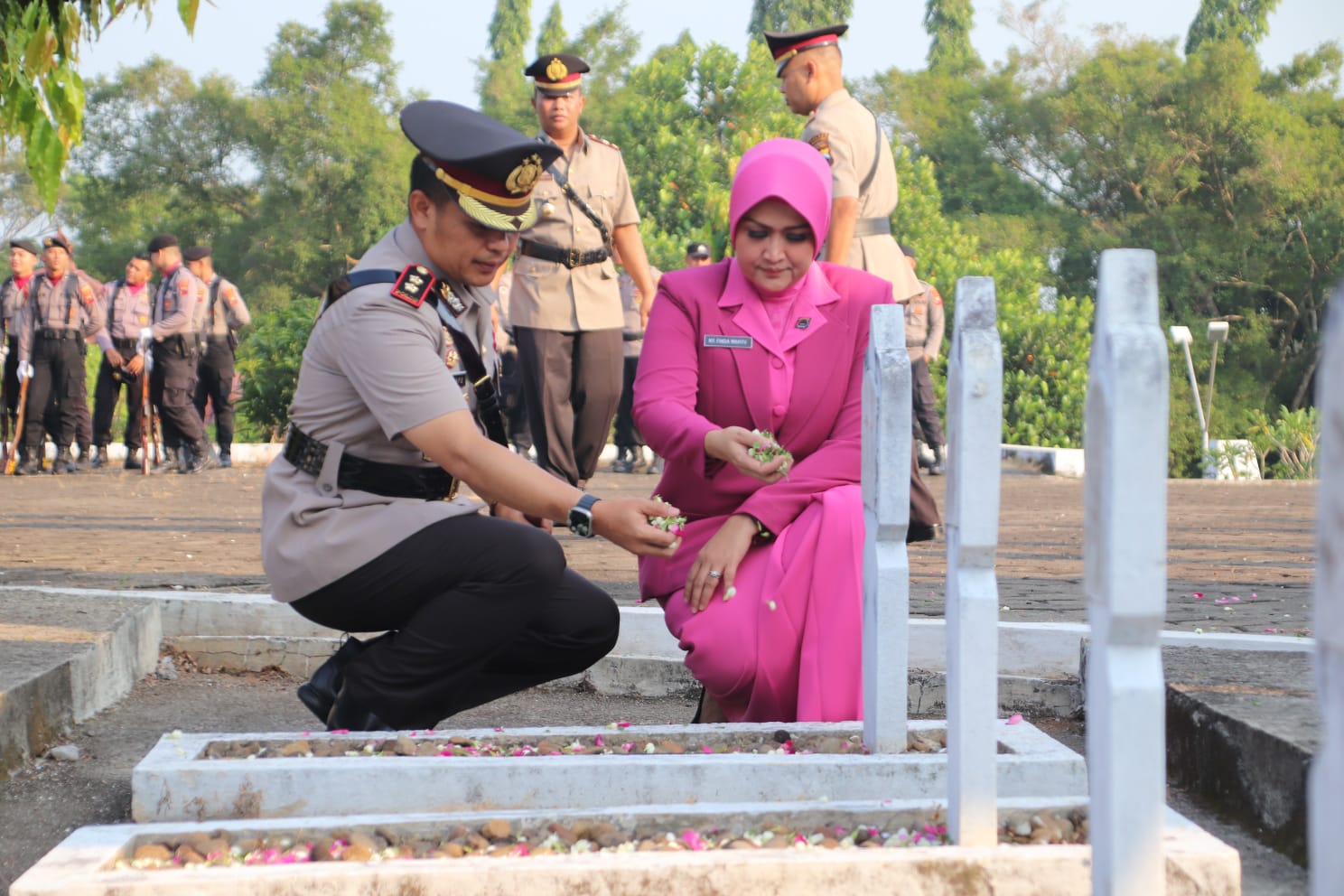 “Adapun upacara ziarah dan tabur bunga ini merupakan rangkaian kegiatan peringatan hari Bhayangkara ke 77. Selain itu, juga sebagai bentuk penghormatan dan penghargaan terhadap jasa-jasa para pahlawan pejuang kemerdekaan yang telah gugur mendahului kita,” ungkapnya.