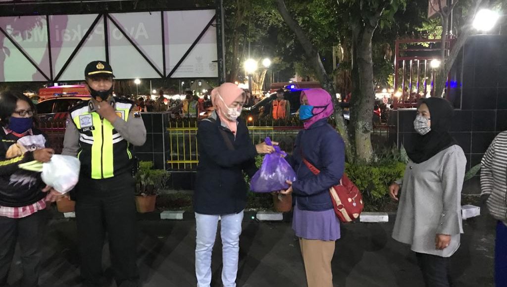 Selain memberi himbauan, petugas juga membagikan sayur sebanyak 600 (Enam ratus) bungkus yang berisikan, Lobus, tomat, kacang panjang, wortel, seledri, ketela dan lain – lain, kepada masyarakat yang berada di Alun Alun Kota Magelang.